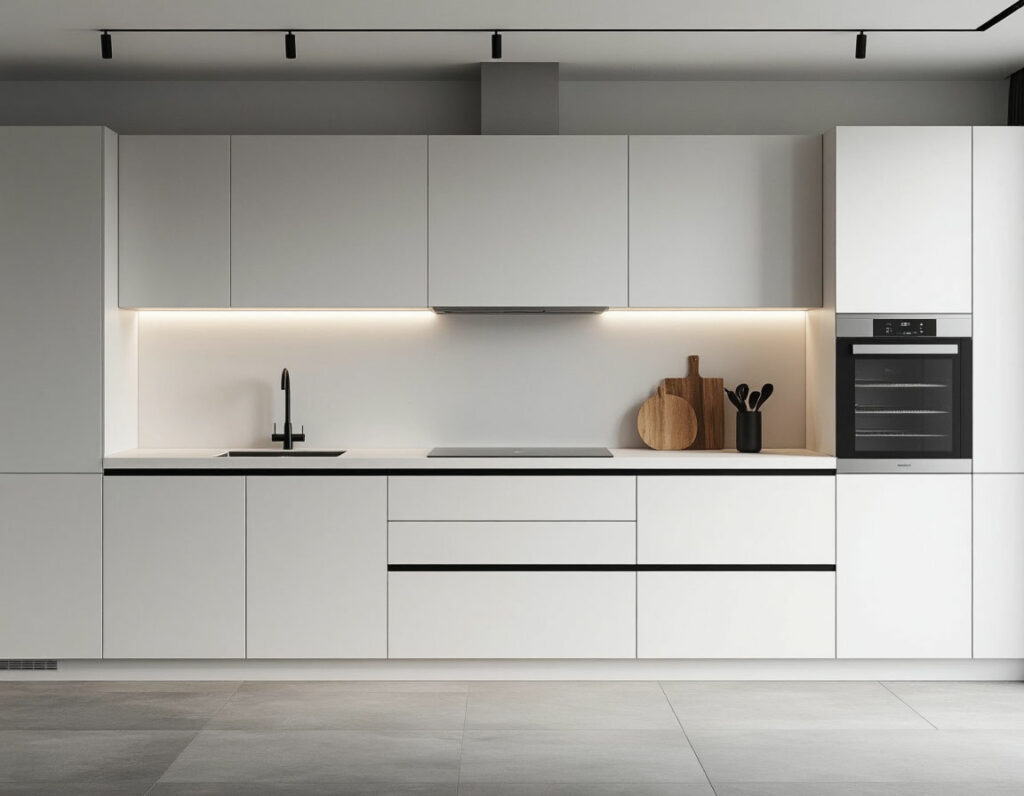 Кроме того, прямая кухня предоставляет дизайнеру чистое поле для решений с акцентами: контрастные фасады, текстурированные материалы или монохромный ансамбль — всё это легко реализуемо без изменения планировки.