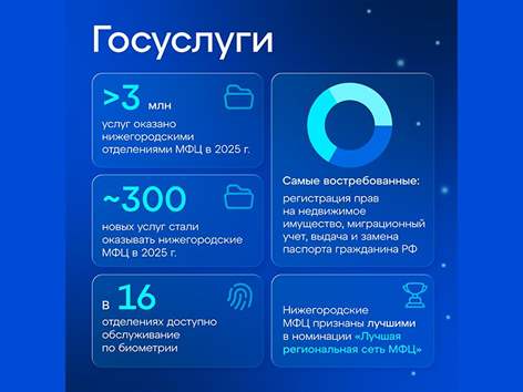 Нижегородские отделения МФЦ начали оказывать около 300 новых государственных и муниципальных услуг в 2025 году. Внедряется обслуживание биометрии без предъявления паспорта – это можно сделать уже в 16 отделениях. Регион сохраняет лидерскую позицию среди других субъектов РФ по использованию сервиса для передачи данных из цифрового профиля гражданина на едином портале госуслуг (ЕПГУ) в информационную систему МФЦ «ГосQR» (запущен в регионе в 2024 году) – он применялся более 140 тысяч раз.